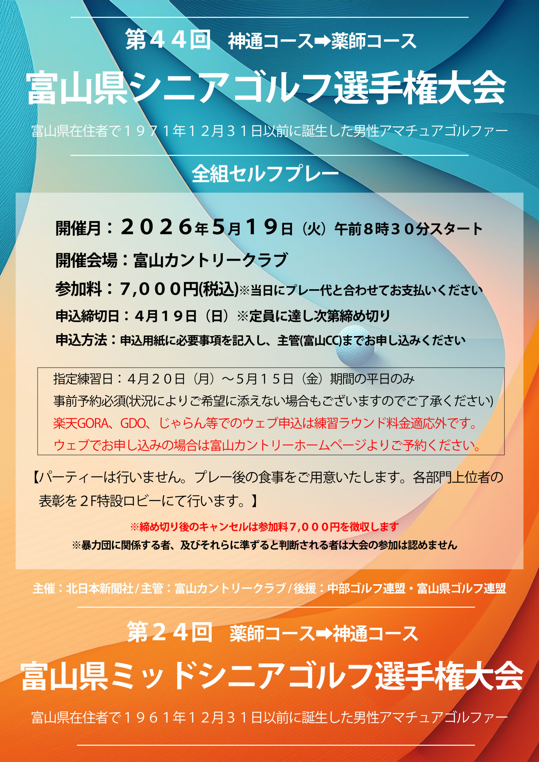 富山県シニア・ミッドシニアゴルフ選手権大会 2026年03月25日 受付方法:FAX(076-468-2747)またはお申し込み用紙記入の上、当クラブにご持参ください。 ※申込用紙は富山県内の各ゴルフ場・練習場にございます 第44回県シニア実施要項 第24回県ミッドシニア選手権実施要項 Share Tweet